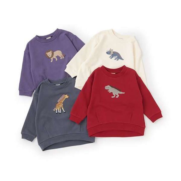 This sweatshirt features different animal and dinosaur embroidery depending on the color.