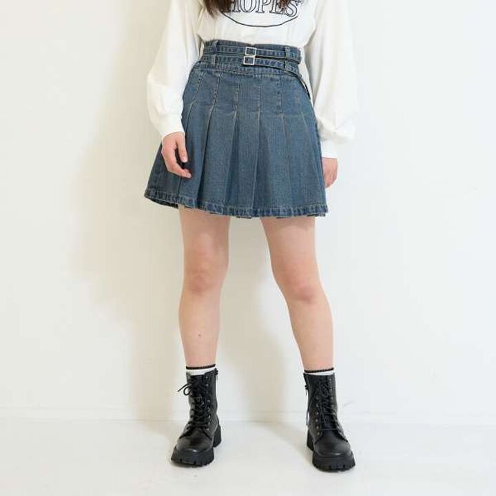 Angel Pouch Checkered Denim Pleated Skirt-Pants,, medium