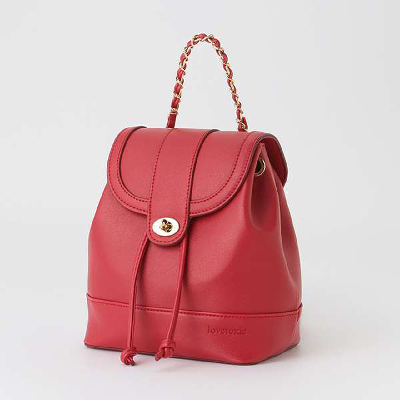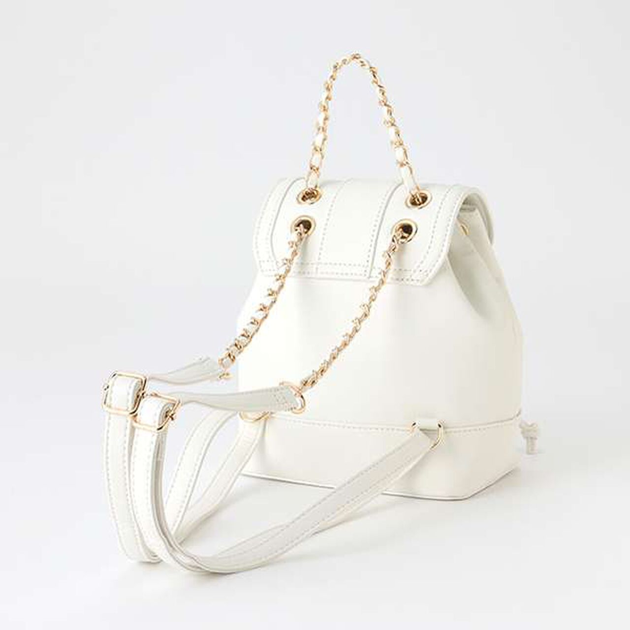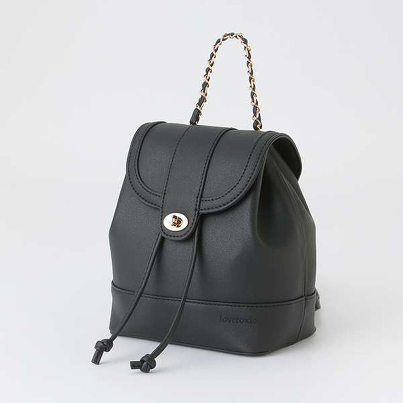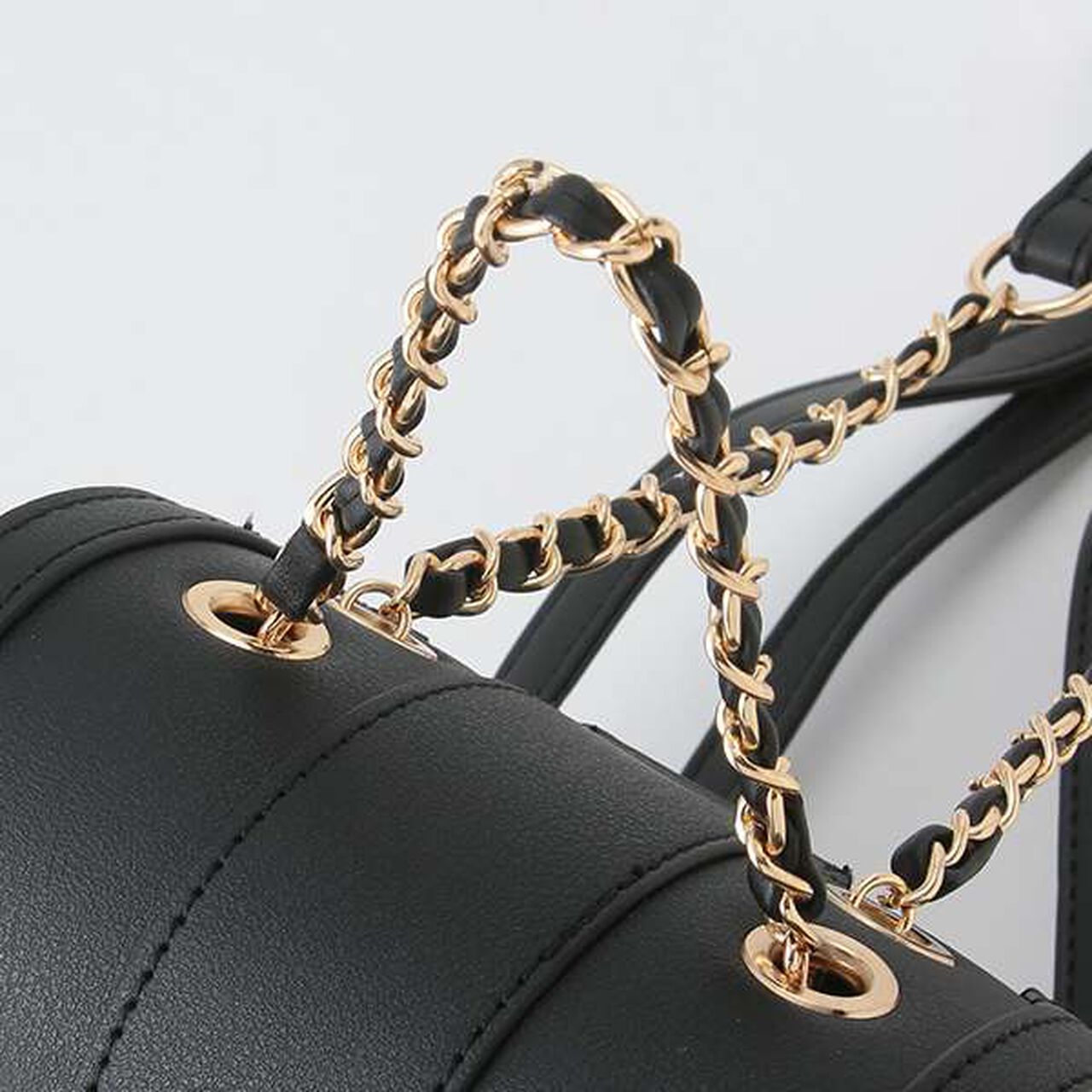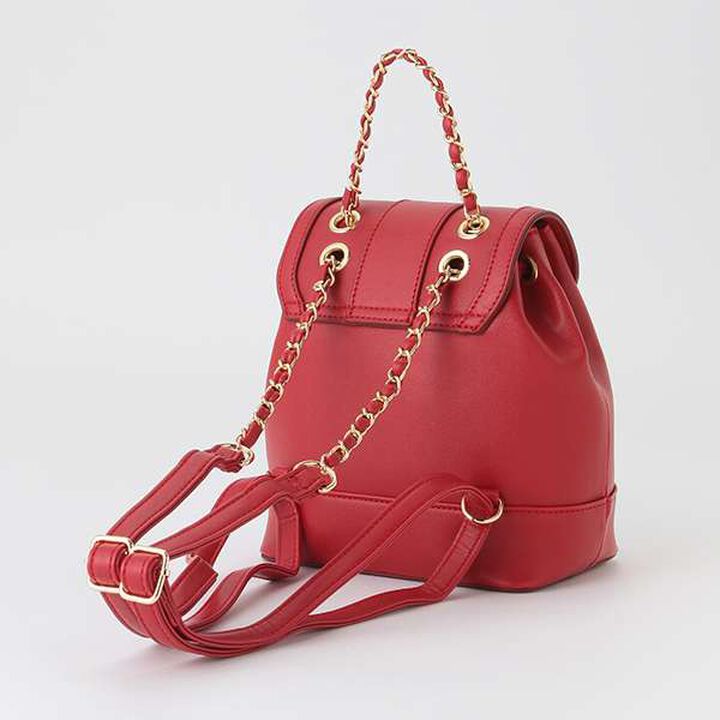 This is a flap mini backpack adorned with chains on the handle and shoulder strap.